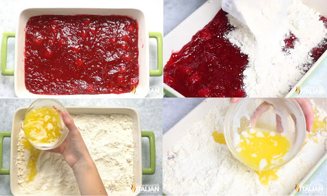 Then, sprinkle the cake mix evenly over the top of the pie filling. Finally, drizzle melted butter over the entire thing and shake to distribute evenly.