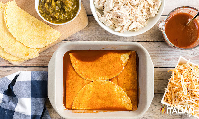 - Add 1 cup of enchilada sauce to the bottom of your casserole dish. Add 4 tortilla halves to the bottom of the dish and flip over to coat both sides in the sauce. Place the tortillas with the cut edge against the side of the pan so it covers the bottom of the dish.